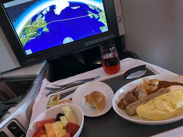Bij binnenkomst in het vliegtuig heerst er gelijk rust in het afgesloten stuk van het vliegtuig waar de businessclass stoelen zich bevinden. Eenmaal je plekje gevonden heb je ruimte genoeg voor je tas, je hebt namelijk een eigen bagagevak, maar naast je ruime stoel is ook gelijk een tafel, waar je van alles op kan leggen. Er staat een flesje water voor je klaar en je kan al een drankje krijgen. De cabine personeel loopt al rond om te vragen wat je straks eenmaal hoog in de lucht wil gaan eten. En dit eten wordt dan netjes geserveerd op je eigen ruime tafel met een tafelkleed en porseleinenservice en ijzeren bestek.