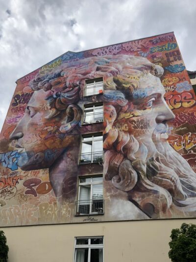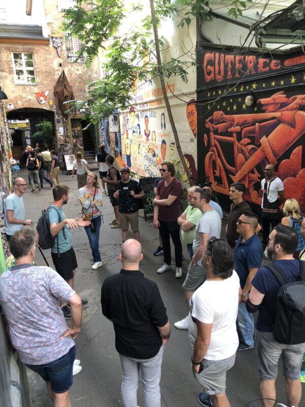 Voor het middagprogramma heb ik Mattie een lokale gids gevonden die ons voor drie uur meeneemt in zijn Berlijn. Een goede mengelmoes van street art, tweede wereldoorlog en alle verhalen over de Berlijnse muur. Hij vertelt met zoveel passie dat iedereen gemakkelijk zijn aandacht erbij houdt. Na een geweldige rondleiding met een koffiestop levert hij ons op zo’n vijfhonderd meter van het hotel weer af, in het meest geweldige kunststraatje in de Joodse wijk.