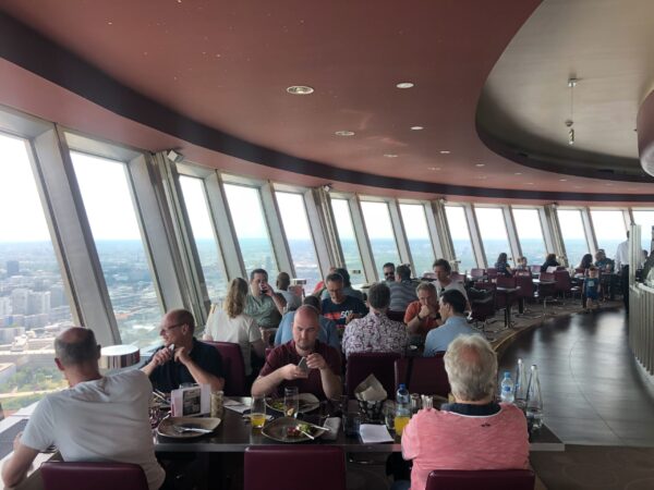 Tijd om de kamersleutels weer in te leveren en de tassen in de opslag van het hotel te leggen, onze vlucht gaat pas vanavond en we hebben nog veel te doen. We nemen de metro naar het beginpunt van onze fietstour. De groep wordt verdeeld in tweeën en we gaan met Nederlandse gidsen op pad. Veel bekende hoogtepunten, maar ook stukjes waar je niet zo snel zou komen. Een fietstocht van drieënhalf uur. Na dit actieve ritje heeft iedereen honger gekregen en gaan we weer met de metro richting ons lunchrestaurant. Een hele speciale en een mooi afsluiter, we gaan namelijk heel hoog lunchen in de TV-toren (Fernsehturm, 368 meter hoog). Wist je dat het restaurant in een half uur een heel rondje heeft gedraaid? Superleuk om zo tijdens de lunch te zien hoe de stad er van boven uit ziet. Tegen vieren gaan we terug naar het hotel om de tassen op te halen. We stappen dit keer met de hele groep in de transferbus naar de luchthaven voor de vlucht terug.