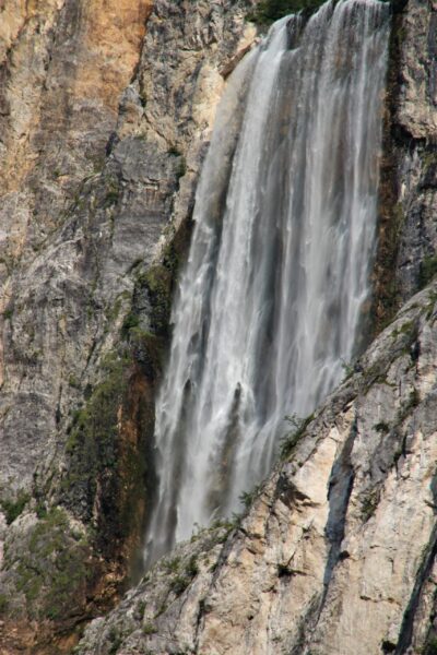 Vervolgens rij je terug naar Bovec en ga je door het kleine gezellige centrum naar de Slap Virje. Het weggetje naar de parkeerplaats wordt steeds smaller en twee auto’s langs elkaar gaat niet. Helaas voor ons dus één keer een stuk in z’n achteruit de berg af. Aangekomen bij de parkeerplaats betaal je €5,- voor 2 uur. De waterval is absoluut de moeite waard. Het geweldig groene water, genoeg bankjes om te picknicken en als de zon schijnt kun je makkelijk een duik in het koude water doen. Helaas voor ons is er opeens een enorme onweersklap en komt het water met bakken uit de lucht. Als we weer terug bij de auto zijn, zijn we helemaal doorweekt.