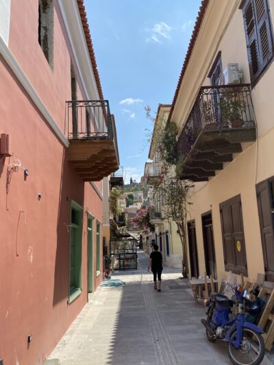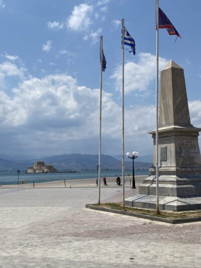Om stipt negen uur staat er bij de receptie een huurauto voor ons klaar. Na een korte check van de auto gaan we op pad. Het is een lange rit vandaag, ook omdat we een aantal extra stops hebben ingelast. We manoeuvreren door de drukke straten van Athene en na ruim een half uur zijn we de stad uit (lang leve Google Maps). Onze eerste stop is het kanaal van Kortinthe. Een mega kloof in de aarde. Als je aan komt rijden heb je helemaal niet het idee dat het zo diep is. Echt heel diep. Met mijn hoogtevrees is dit niet te doen, over het smalle bruggetje lopen en in de diepte het kanaal bekijken. Ik laat dus wat foto’s maken door de mannen. Na een korte stop rijden we verder naar het theater van Epidauvros. De toegangsprijs is €12,- per volwassene, best prijzig, maar gelukkig zijn kinderen onder de 25 jaar gratis als ze uit de EU komen. Dat scheelt ons weer. We rijden een half uurtje verder naar Napflio, waar we lunchen en wat door de straatjes slenteren. Vanaf hier is het nog ruim twee uur naar onze eindbestemming. Wat een juweeltje van een appartement. Het zijn eigenlijk 4 appartementen bij elkaar, maar we hebben het hele complex voor onszelf. Maar liefst vier zwembaden en frontaal zeezicht!