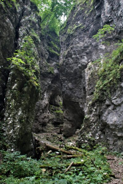 We rijden terug richting Bled, maar dan via de bergen en niet de gewone saaie rechte weg. Smalle steile weggetjes door de bergen, met allemaal kleine bergdorpjes. Af en toe kom je een enorm resort tegen, waar je nu allerlei zomeractiviteiten kunt doen en in de winter vast kunt skiën. De kloof die we gaan wandelen is er eentje die ik nog nergens in een blog ben tegen gekomen. Hij stond in het boekje van de Julian Alps kaart. Een kloof waarvoor je niet hoeft te betalen, die niet heel erg toeristisch is en weer heel anders dan de andere. Er stroomt geen water. Je moet er om het hele rondje te doen aardig klimmen en soms klauteren. Maar echt wel de moeite waard. Als is het alleen voor het feit dat je weinig mensen ziet. De parkeerplaats is erg klein, er kunnen maar een stuk of 20 auto’s staan. We doen ongeveer 1.5 uur over de wandeling.