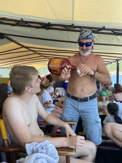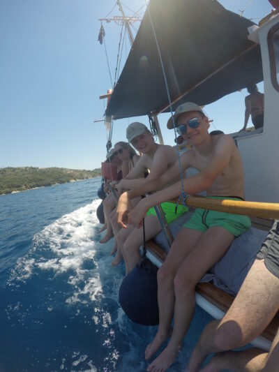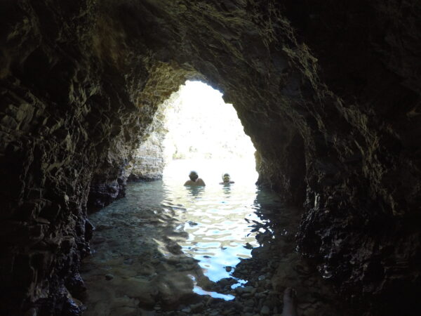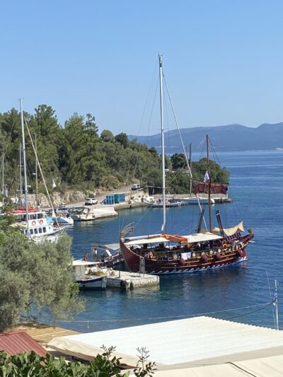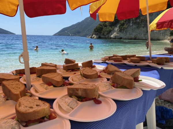 Na een paar dagen bergen gaan we weer eens richting strand. En rit van bijna vijf uur. Het duurt zo lang omdat je eerst, tot aan Patras, alleen maar bergen en slingerweggetjes hebt. Wel een hele mooie route. Eenmaal bij Patras zijn we even aan de haven gestopt om een broodje van de bakker te eten en naar de ferryboten te kijken. Je kunt ervoor kiezen om met de ferry naar de overkant te gaan, die zouden iedere 20 minuten gaan, maar zo zag het er niet uit. Er ging ook niemand op de ferry. Of je neemt de hele lange brug die loopt vanaf het schiereiland naar het vaste land. De brug kost bijna €14,- aan tol, maar je bent wel lekker snel aan de overkant. De volgende twee uur zijn vrij saai. Half snelweg en half binnendoor, de omgeving is niet echt bijzonder en verre van toeristisch. Als we eenmaal op Lefkas aankomen, is het er enorm druk. Zo’n drukte zijn we nog nergens tegengekomen, je merkt aan alles dat dit een eiland is. Alleen te bereiken langs een soort lange afsluitdijk. Lefkas is natuurlijk een groot populair vakantie-eiland. Ons appartement ligt in Nikania, een lintdorpje aan de drukke weg, waar weinig te beleven is. Achteraf vind ik het kustplaatsje Nidri leuker, zeker als je geen auto hebt, want er zijn veel leuke winkeltjes restaurantjes op loopafstand. Hier kun je ’s avonds lekker door de winkelstraat slenteren. Lefkas staat vooral bekend om zijn strandjes. Heel veel meer is er niet te doen volgens de lokale bevolking. Daarom besluiten we om twee dagen op zee door te brengen. De eerste dag gaan we mee op de Odysseia Lefkada, een houten zeilschip. We bezoeken meerdere stranden en eilandjes om te snorkelen en barbecuen op het strand. De boot is niet al te groot, wat zeker plezierig is, omdat er niet zoveel mensen op kunnen. Er gaan namelijk ook van die schepen met meer dan 250 mensen aan boord. Ik denk dat er bij ons ongeveer 50 tot 60 mensen mee kunnen. Aan boord zijn snorkels die je kunt lenen, dus die hoef je niet zelf mee te nemen. De tweede dag op het water gaan we op een nog kleiner bootje van Lefkada Paddleboard Cruises, met maar maximaal 12 mensen. We leggen weer op andere strandjes aan. Ook hier zijn snorkels aan boord en supboards, want ook kun je bij ieder strandje suppen. Er is op dit bootje wat minder schaduw, daardoor moeten we blijven drinken en veel smeren. Maar we hebben weer een hele leuke dag.