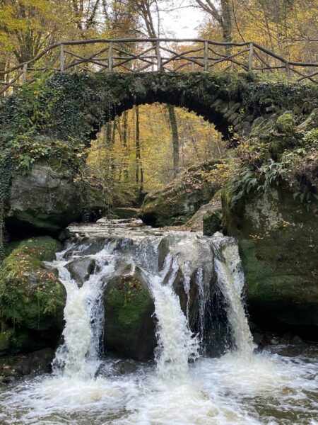 Onze tweede wandeling, W6, bracht ons naar Heringer Miller. We begonnen op de parkeerplaats bij het toeristeninformatiepunt. Eerlijk gezegd was deze wandeling niet echt de moeite waard, behalve het stukje door het bos naar de brug. Misschien was het ooit mooier geweest, maar er was nu een omleiding aangegeven, waardoor het grootste deel van de route niet zo interessant was. Gelukkig maakte de Schiessentümpel-brug, een van de meest iconische plekken in Mullerthal, dit gebrek aan indrukwekkendheid goed. Deze historische brug overspant een kleine waterval en is uiterst fotogeniek.
