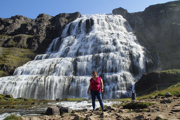 Wij rijden door naar de Dynjandi Waterval. Dit is een van de indrukwekkendste watervallen van IJsland. Het zijn er een stuk of 10 bij elkaar en daarom enorm om te zien. Vanaf de parkeerplaats kun je helemaal naar boven lopen en heb je een weids uitzicht over de fjord. We nemen hier ruim de tijd en als we weer beneden komen, genieten we nog even van de zon aan een van de picknicktafels.