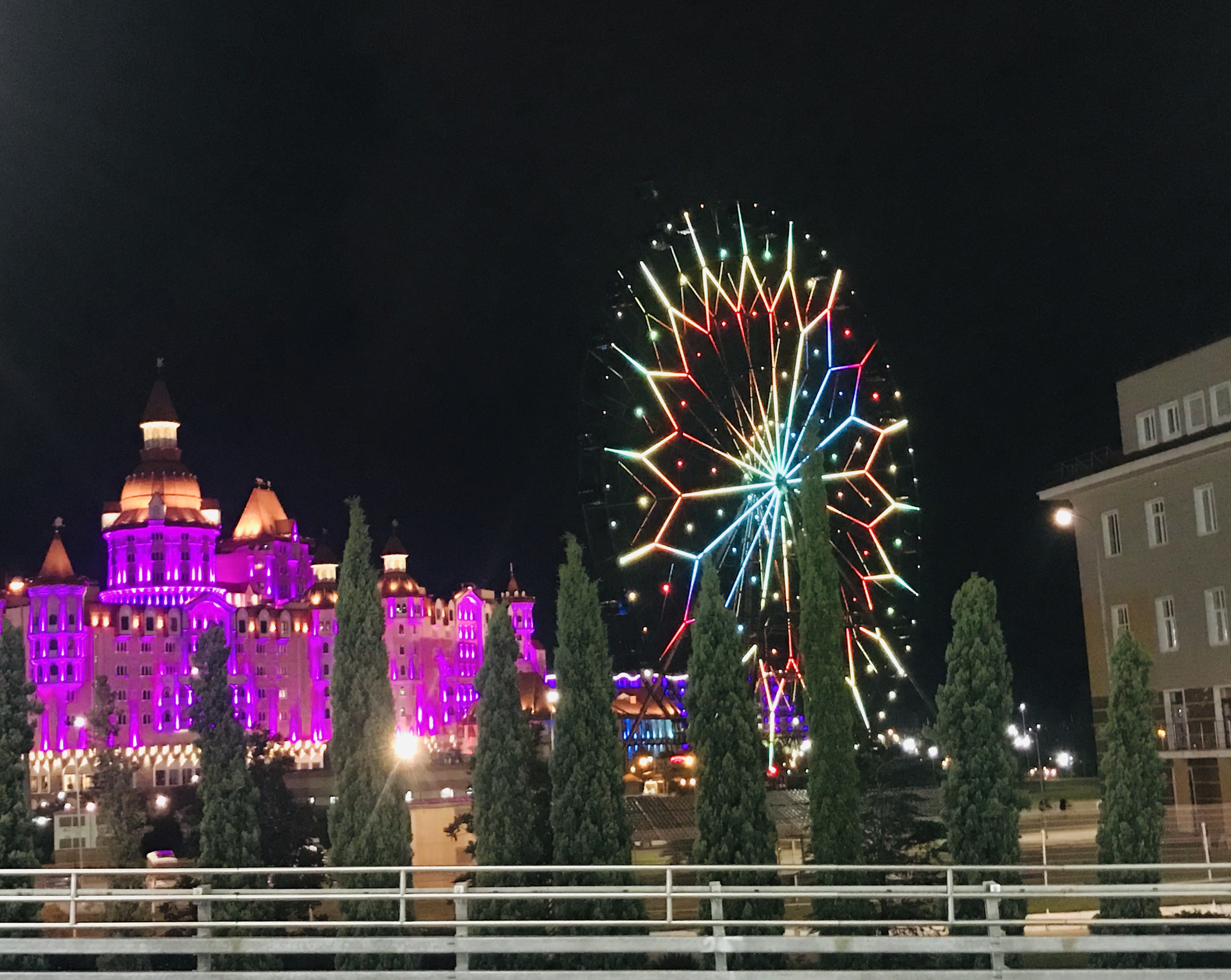 De volgende morgen staan de gidsen ons op te wachten. In Sotsji heb je zeker een tolk/gids nodig, kom je in Moskou nog wel eens een Rus tegen die een klein beetje Engels spreekt, hier helemaal niet. Ze blijven gewoon stug in het Russisch doorpraten, eerst rustig en vervolgens steeds luider, ook al heb je al 10x aangegeven dat je er niets van verstaat. We doen een korte tour door de stad. Sotsji is de badplaats van de Russen, vergelijkbaar met de Spaanse Costa’s. Het weer is veel aangenamer en we kunnen hier ’s avonds een zomerjas aan en overdag lekker in een korte broek. We brengen een bezoekje aan de botanische tuin en de haven. De lunch is in The Lighthouse, een restaurant dat prachtig aan de Zwarte Zee ligt.
