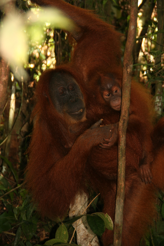 - Een andere ochtend zijn we ’s morgens vroeg uit de veren voor een tocht onder begeleiding van een ranger. Een steivge ochtendklim later bevinden we ons in het leefgebied van de Orang Oetans. Wij zijn er de enige mesnen en spotten algauw wat kleine aapjes. Onze ranger heeft voldoende bananen bij zich om hen te voeren, zodat ze heel dichtbij komen en we mooie foto’s kunnen maken. En ja….niet veel verderop zit dan een prachtige enorme mannetjes-Orang Oetan op een tak…. En wij mogen hem gewoon stukjes banaan voeren! Een voor een pakt hij de stukjes gewoon uit onze hand. Wat verderop zit een moeder met kind, vanwege het mannetje durft ze niet dichterbij te komen. Pas in de buurt van de ‘officiële’ voederplaats komen we een paar mensen tegen. We trekken nog verder het oerwoud in en komen oog in oog met een Orang Oetan-gezinnetje: vader, moeder, kind. Ook deze drie komen weer heel dicht bij ons en eten rustig van onze meegebrachte bananen. Wat een ervaring!