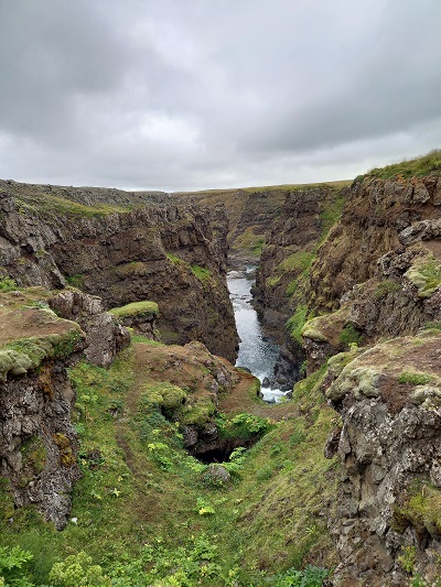 Na een goede nachtrust en een ontbijt vertrekken we weer op tijd richting Húsavík. Ook nu weer een lange rit, maar er zijn gelukkig wat stops om even uit de auto te stappen. Het is vanmorgen zwaar bewolkt en af en toe hebben we een spatje regen. Na bijna 45 minuten slaan we een onverhard pad in richting de Kolufoss Canyon. Een mooie uitgeslepen kloof, waar met flinke kracht een waterval in stort.